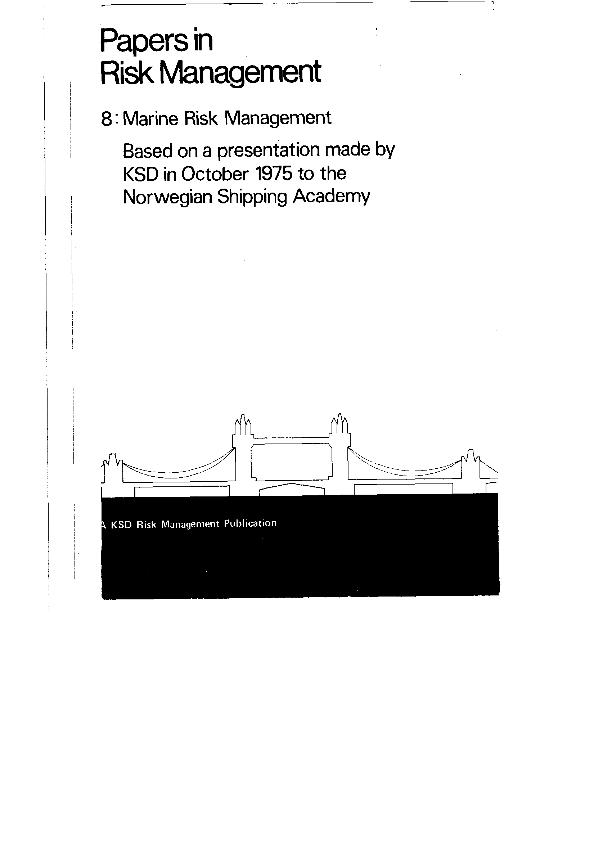 Sección: Documentos electrónicosTítulo: Marine risk management / based on a presentation made by KSD in october 1975 to the Norwegian Shipping AcademyPublicación: London : Keith Shipton Developments Limited, 1977Descripción física: 30 p. ; 21 cmSerie: (Papers in risk management ; 8)Materia / lugar / evento: Seguro marítimoGerencia de riesgosSerie secundaria: Papers in risk management ; 8Otras clasificaciones: 326.3Derechos: In Copyright (InC)