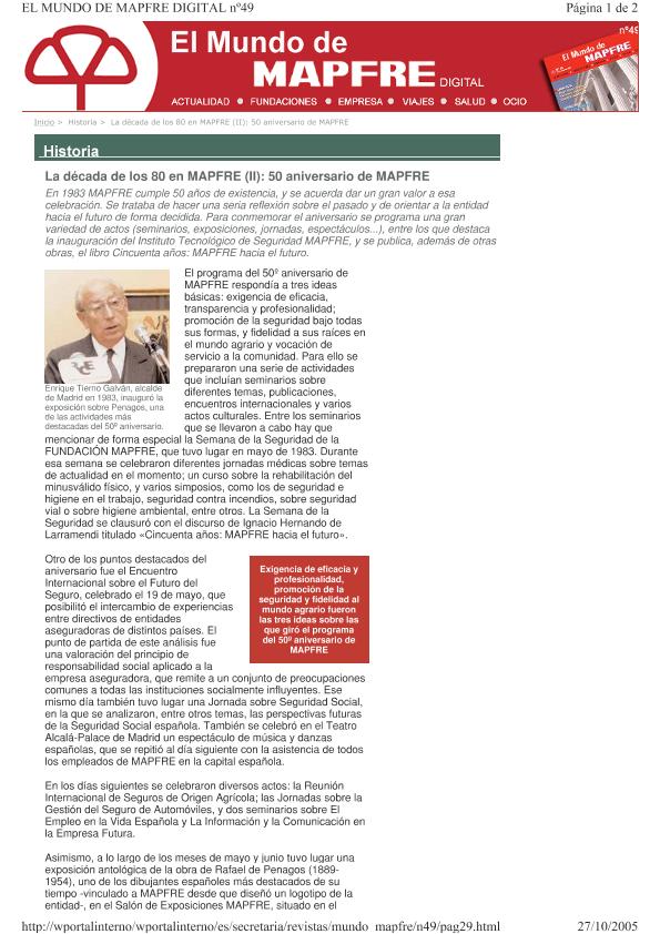 Notas: En 1983, MAPFRE cumple 50 años de existencia, y se acuerda dar un gran valor a esa celebración. Se trataba de hacer una seria reflexión sobre el pasado y de orientar a la entidad hacia el futuro de forma decidida. Para conmemorar el aniversario se programa una gran variedad de actos, entre los que destaca la inauguración del Instituto Tecnológico de Seguridad MAPFRE, y se publica, además de estas obras, el libro "Cincuenta años: MAPFRE hacia el futuro"Registros relacionados: En: El Mundo de MAPFRE. - Madrid : Dirección de Comunicación del Sistema MAPFRE. - Nº 49, 3er. trimestre 2005 ; p. 30-31Materia / lugar / evento: Sistema MAPFRE Empresas de seguros Evolución histórica Historia del seguro Títulos secundarios: Título: Mundo MAPFRE
