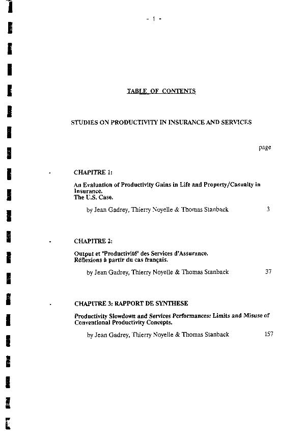 Sección: Documentos electrónicosTítulo: Studies on productivity in insurance and services / by Jean Gadrey, Thierry Noyelle & Tomas StanbackAutor: Gadrey, JeanPublicación: [Genève] : Association Internationale pour l'Etude de l'Economie de l'Assurance, 1992Descripción física: 213 p. ; 31 cmSerie: (Études et dossiers ; 171)Notas: Sumario: An evaluation of productivity gains in life and property/casualty in insurance. The U.S. case -- Output et productivité des services d'assurance. Réflexions à partir du cas français -- Productivity slowdown and services performances: limits and misuse of conventional productivity concepts.Materia / lugar / evento: SegurosProductividadSector serviciosOtros autores: Noyelle, Thierry Stanback, Thomas Association Internationale pour l'Etude de l'Economie de l'Assurance Serie secundaria: Études et dossiers ; 171Otras clasificaciones: 10Derechos: In Copyright (InC)