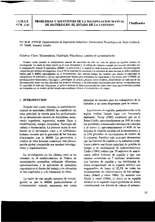 Problemas y soluciones de la manipulación manual de materiales : el estado de la cuestión