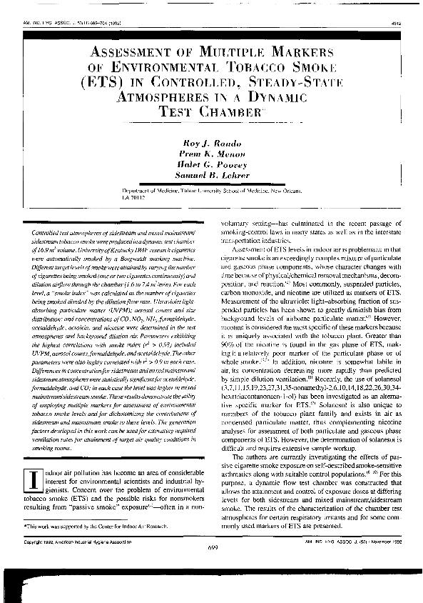 Assessment of multiple markers of environmental tobacco smoke (ETS) in controlled, steady-state...