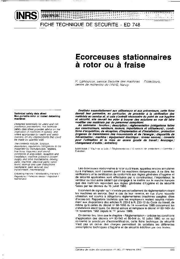 Ecorceuses stationnaires à rotor ou à fraise : fiche technique de sécurité