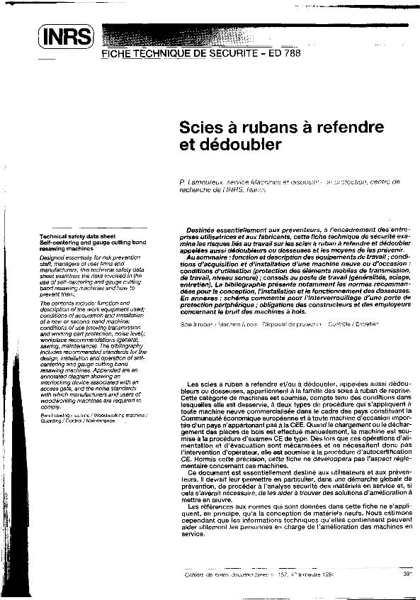 Scies à rubans à refendre et dédoubler fiche technique de sécurité -ED 788