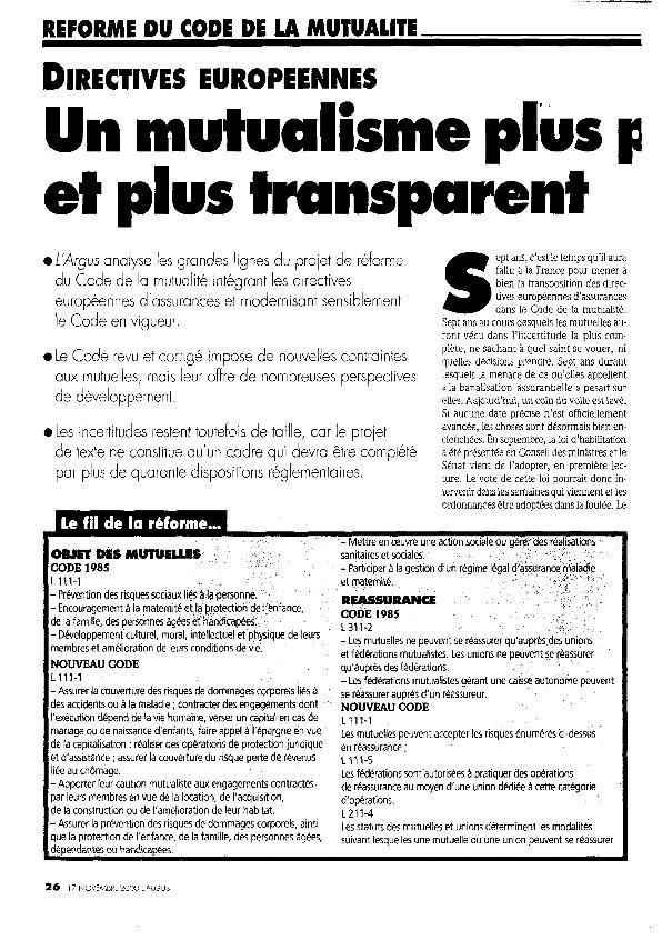 Un Mutualisme plus professionnel et plus transparent : directives européennes : reforme du Code...