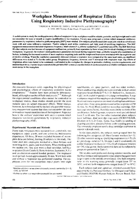 The Use of inductive plethysmography in the study of the ventilatory effects of respirator wear