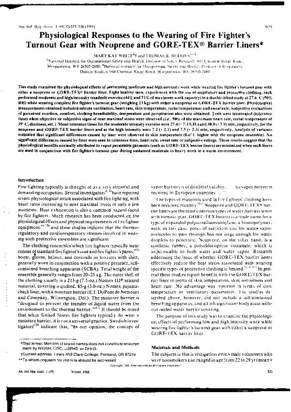 Physiological responses to the wearing of fire fighter's turnout gear with neoprene and GORE-TEX...