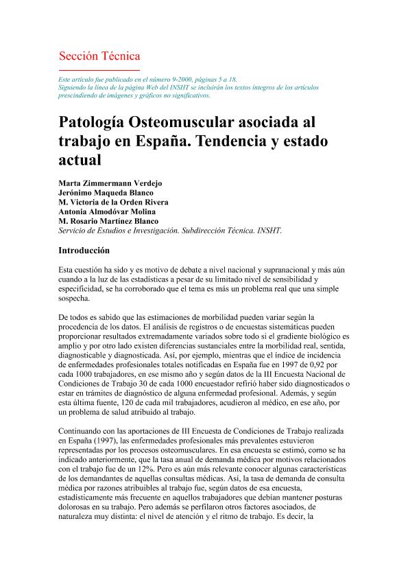 Patología osteomuscular asociada al trabajo en España : tendencia y estado actual