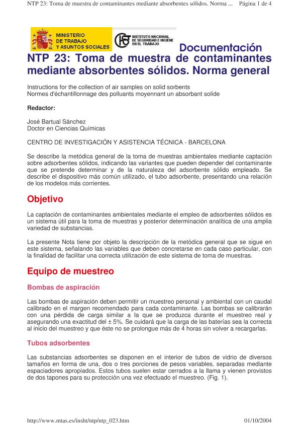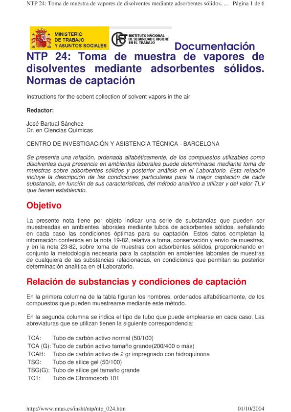 Toma de muestra de vapores de disolventes mediante absorbentes sólidos : normas de captación