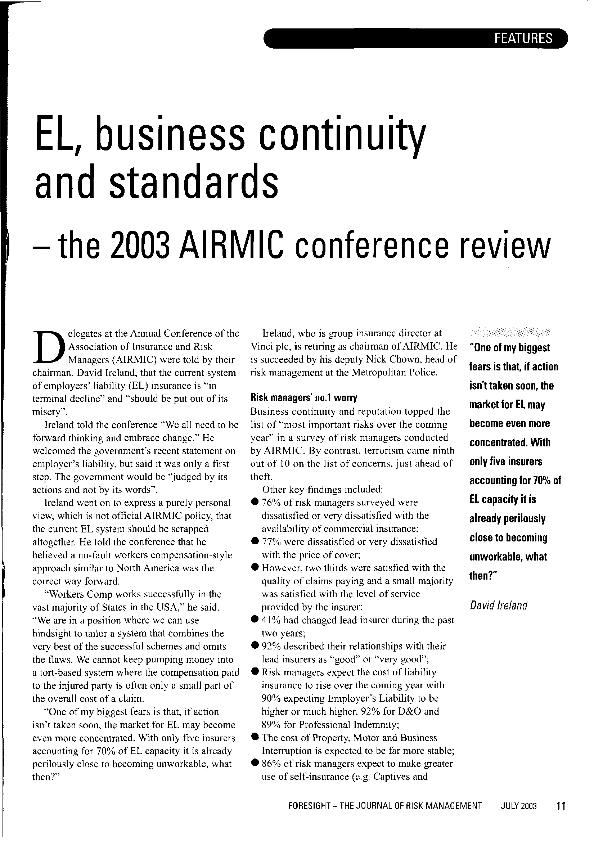 EL, business continuity and standards : the 2003 AIRMIC conference review