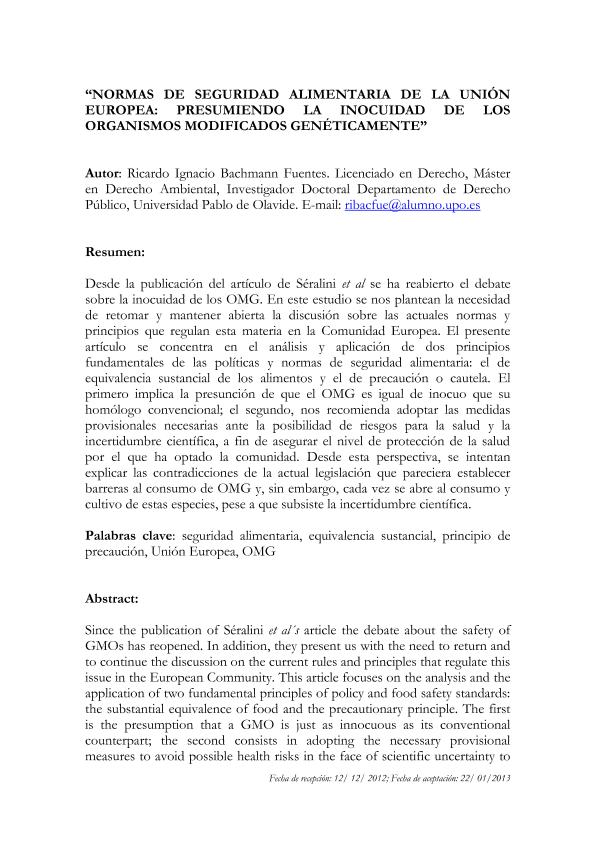 Normas de seguridad alimentaria de la Unión Europea : presumiendo la inocuidad de los Organismos...
