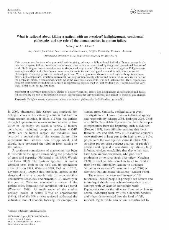 - En: Ergonomics : the international journal of research and practice in human factors and ergonomics. - Oxon [United Kingdom] : Taylor & Francis, 2010- = ISSN 0014-0139. - 04/03/2013 Volumen 56 Número 3 - marzo 2013 , p. 357-364