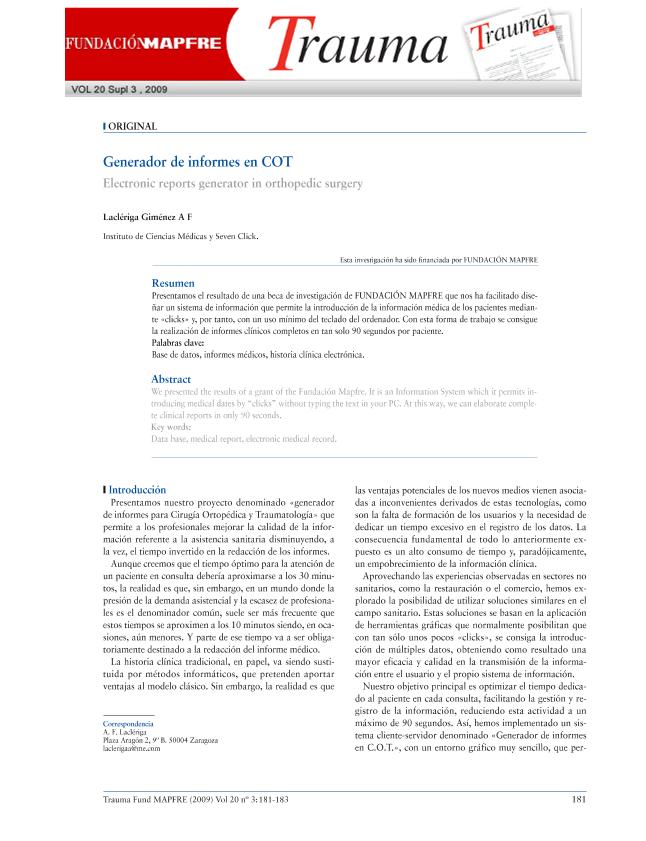 - En: Trauma : (fusión de la revista MAPFRE Medicina y la revista Patología del Aparato Locomotor). - Madrid : FUNDACION MAPFRE, Instituto de Prevención, Salud y Medio Ambiente, 2008-2015 = ISSN 1888-6116. - 01/07/2009 Volumen 20 Número 3 - julio 2009 , p. 181-183
