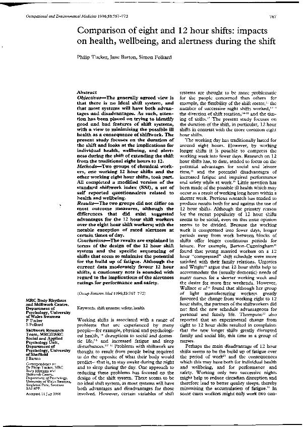 Comparison of eight and 12 hour shifts : impacts on health, wellbeing, and alertness during the...