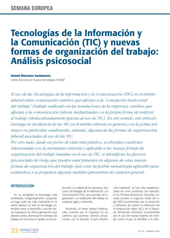 Sección: ArtículosTítulo: Tecnologías de la Información y la Comunicación (Tic) y nuevas formas de organización del trabajo : análisis psicosocial / Noemí Manzano SantamaríaAutor: Manzano Santamaría, NoemíNotas: Sumario: El uso de las Tecnologías de la Información y la Comunicación (TIC) en el ámbito laboral están ocasionando cambios que afectan a la concepción tradicional del trabajo (trabajo realizado en las instalaciones de la empresa), cambios que afectan a la comunicación (ahora mediatizada) o a la propia forma de realizar el trabajo (deslocalizadamente gracias al uso de TIC). En este sentido, este artículo investiga la incidencia de las TIC en el ámbito laboral en general y en la población mayor en particular, analizando, además, algunas de las formas de organización laboral asociadas al uso de las TIC. Por otro lado, desde un punto de vista más práctico, se abordan cuestiones relacionadas con la normativa existente y aplicable a las nuevas formas de organización del trabajo basadas en el uso de TIC, se identifican los factores psicosociales de riesgo que pueden estar presentes en algunas de estas nuevas formas de organización del trabajo (así como la posible metodología aplicable para evaluarlos) y se proponen algunas medidas preventivas de carácter general Registros relacionados: En: Seguridad y salud en el trabajo. - Madrid : INSHT, 1999-. - 02/10/2017 Número 92 - Mes octubre , p. 22-35Materia / lugar / evento: Nuevas tecnologías de la informaciónTecnología de la informaciónRiesgos psicosocialesOtras clasificaciones: 874Derechos: In Copyright (InC) Ver detalle del número