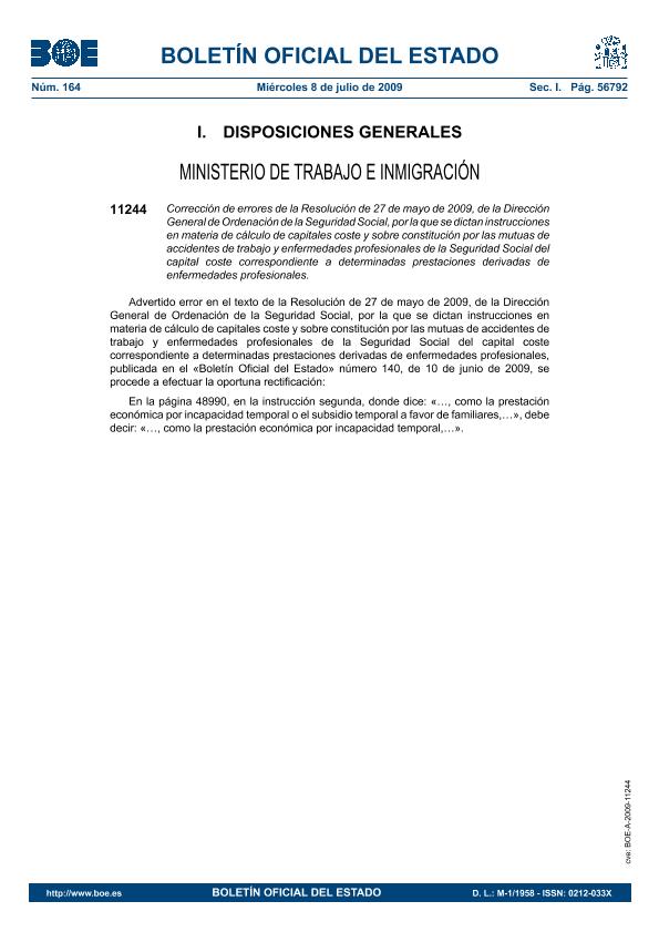 Título: Corrección de errores de la Resolución de 27 de mayo de 2009, de la Dirección General de Ordenación de la Seguridad Social, por la que se dictan instrucciones en materia de cálculo de capitales coste y sobre constitución por las mutuas de accidentes de trabajo y enfermedades profesionales de la Seguridad Social del capital coste correspondiente a determinadas prestaciones derivadas de enfermedades profesionales
